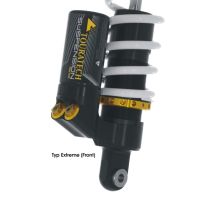 Ce ressort-amortisseur Extreme représente la catégorie haut de gamme en matière de suspension. Même pour les sollicitations les plus extrêmes. Il est doté du PDS intégré, une protection hydraulique contre la rupture par choc qui utilise un deuxième piston amortisseur. Même sur les pistes revêches avec un bagage de voyage complet, pas de rupture par choc car la surcharge mécanique du ressort-amortisseur est empêchée. L'amortissement est asservi à la course. Dans la plupart des situations, le ressort-amortisseur est réglé confortablement et de façon à ménager les forces, avant que le PDS PDS ne prenne le relais dans la dernière partie de la course du ressort-amortisseur. Les points forts du système Telelever-Systems sont accentués par le comportement de réponse fin du ressort-amortisseur Touratech .